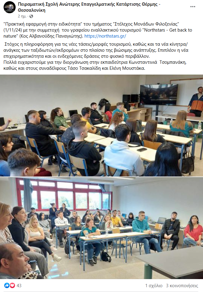 “Πρακτική εφαρμογή στην ειδικότητα” του τμήματος “Στέλεχος Μονάδων Φιλοξενίας” (1/11/24) με την συμμετοχή του γραφείου εναλλακτικού τουρισμού “Northstars – Get back to nature”